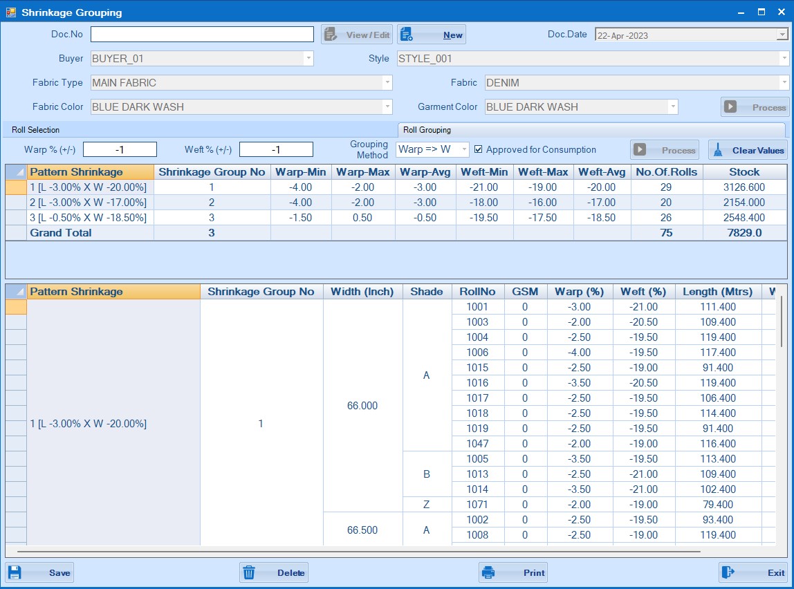 Fabric Shrinkage GroupingGrouping of Fabric Rolls based on Shade, Shrinkages on Warp, Weft is done with ease. |
